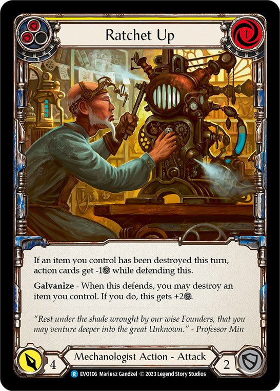 Galvanize - When this defends, you may destroy an item you control. If you do, this gets +2DEFENSE.