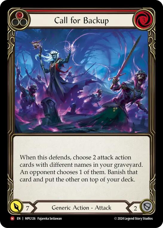 When this defends, choose 2 attack action cards with different names in your graveyard. An opponent chooses 1 of them. Banish that card and put the other on top of your deck.